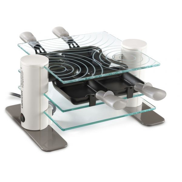 Raclettes 4 personnes avec 3 plateaux fixes en verre trempé, colonnes en thermodurcissable. Pieds en acier peint laqué, cordon 2 mètres. 4 poêlons en aluminium avec revêtement antiadhésif et macnhes en plastique. Interrupteur marche/arrêt, puissance: 600 watts.