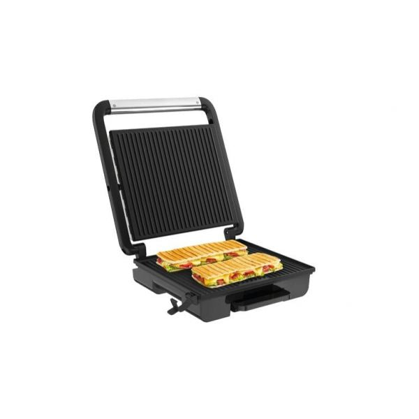 Grille viande 745 cm², soit 28.8 x 25.8 cm Thermostat réglable 3 positions : viande - sandwiches/paninis - légumes Plaques anti adhésives Bac récupérateur de jus amovible - Compact